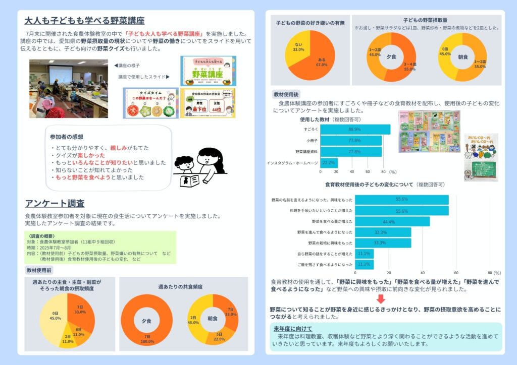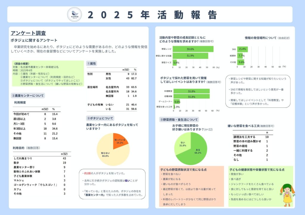 中出ゼミでは「子どもの野菜摂取増加を目指した食育活動」を卒業研究のテーマとして1年間活動を行いました。卒業研究を進めるにあたりご協力いただいた名古屋市農業センターの皆様及びアンケートに参加してくださった皆様、ありがとうございました。